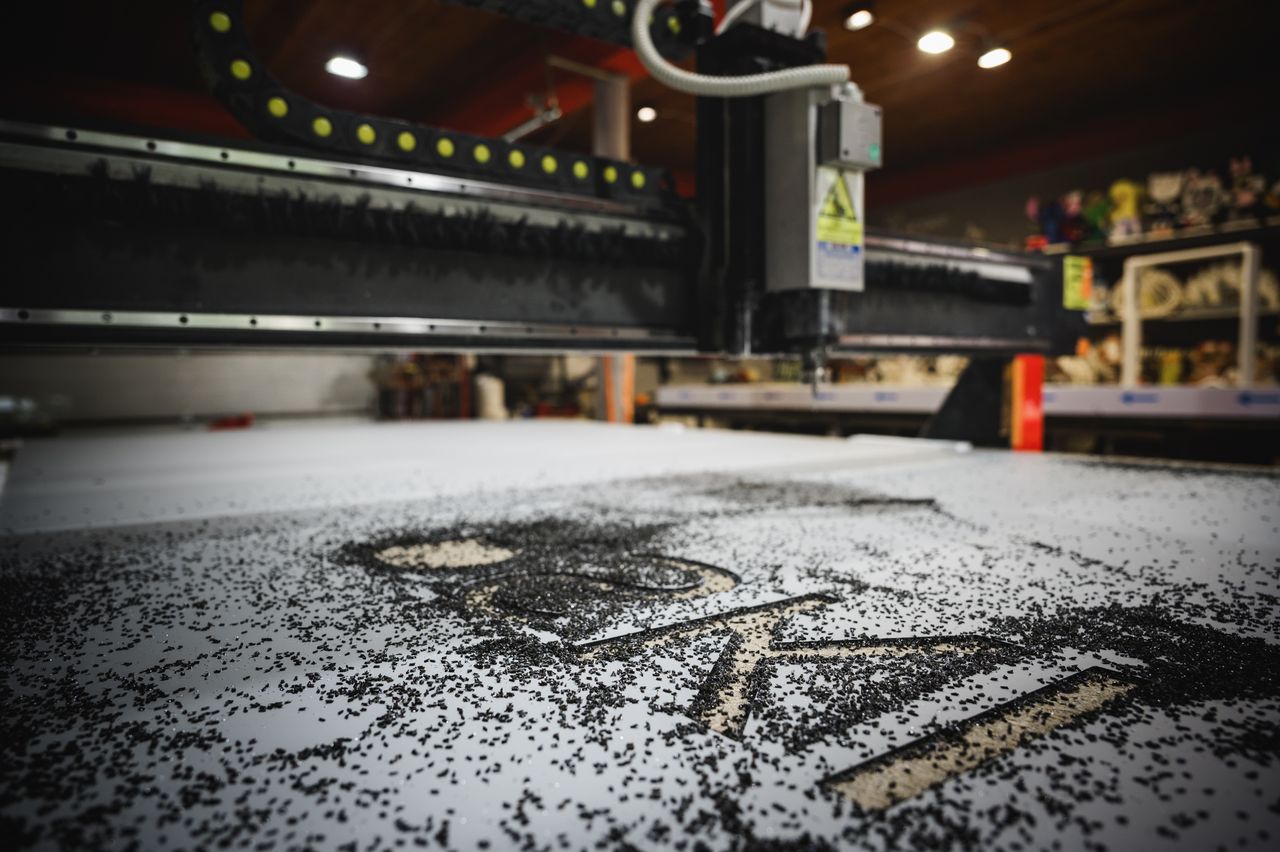 Precyzyjne wycinanie i grawerowanie w materiałach takich jak plexi, dibond, aluminium, PCV czy drewno – idealne do produkcji liter 3D i elementów reklamowych.